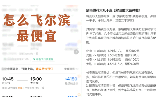 “旺季飞哈尔滨机票好贵呀,不如先飞沈阳再转高铁,省时又省钱!”