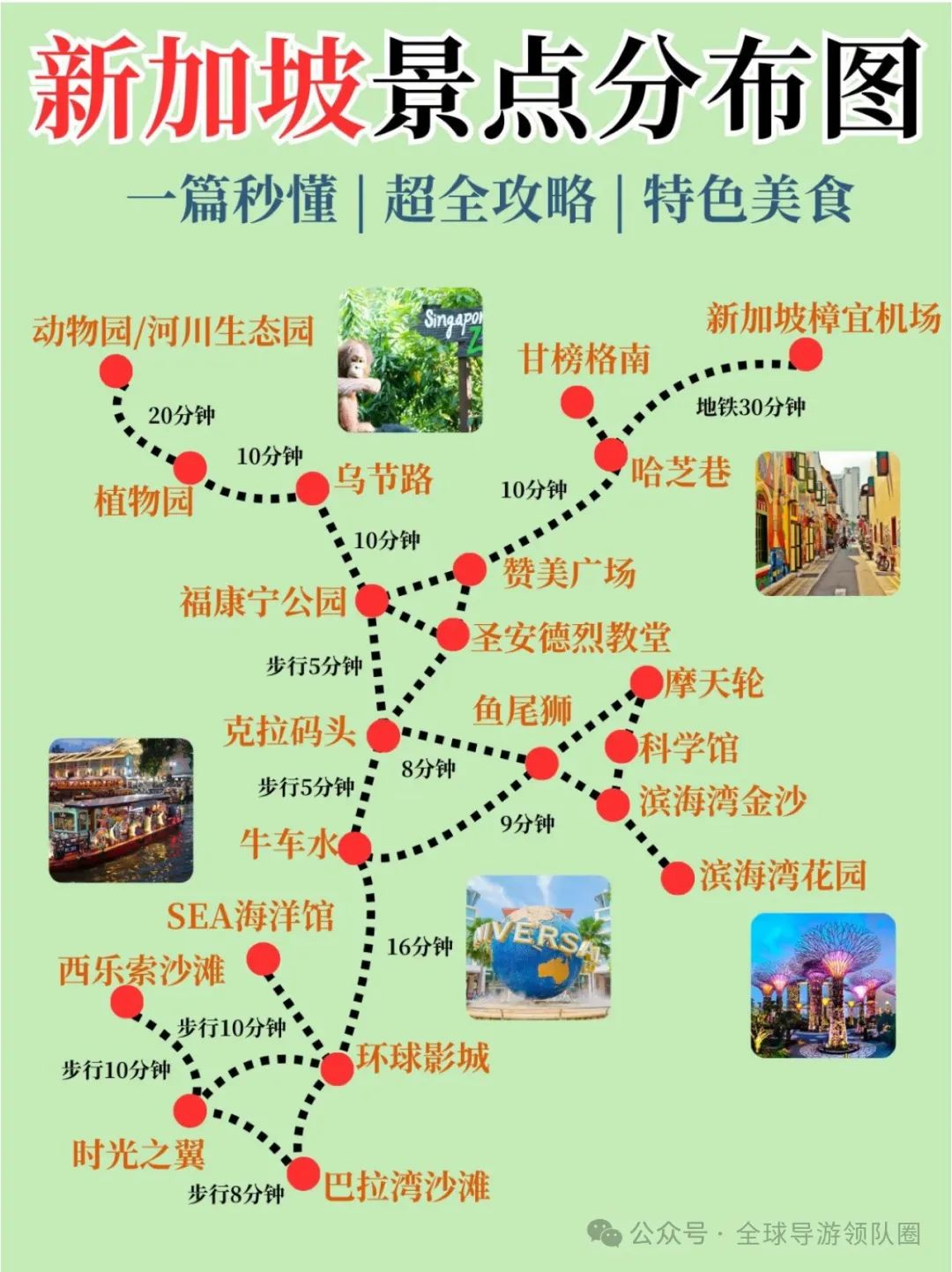 The Fullerton Hotel富丽敦酒店 The Art House 旧新加坡国会大厦 亚洲文明博物馆 维多利亚剧院及音乐会堂&Cavenagh Bridge加文纳桥 Day 3:圣淘沙区域 新加坡南边的一个小岛,岛上有游乐园、大型水族馆,购物中心,也有自然景观,设施开发完善,无论是沿着沙滩散步,或者搭乘岛上免费的穿梭巴士浏览这座岛屿,都是不错的体验。 从Harbour Front 港湾站出闸,随后前往位于怡丰城购物中心3楼的圣淘沙捷运站,搭乘圣淘沙捷运(Sentosa Express) 就可以顺利抵达圣淘沙岛。车票的价格是4新币,岛内乘坐免费以及出岛无需再付费。 一共包含四个站:VivoCity怡丰城、Resorts World名胜世界、Imbiah英比奥、Beach海滩。 Vivo City 怡丰城(也叫圣淘沙捷运站 Sentosa Station) Vivo City 怡丰城 (大型购物中心,有海底捞) Mount Faber Peak Singapore(原珠宝盒缆车,是另一种登岛方式) Resorts World 名胜世界(也叫滨海捷运站 Waterfront Station) 新加坡环球影城:分为7个主题区,分别为:好莱坞、纽约、科幻城市、古埃及、迷失世界、遥远王国及马达加斯加。在不同的节日里环球影城会有不同的装扮,每一次都能带来新鲜感,让人流连忘返。 S.E.A.海洋生物馆:内设有多达45个生态区,汇集了来自超过1,000个物种的100,000多只海洋生物。除了丰富多彩的海洋生物以外,馆内还贴心的设置了中英双文方便来自不同国家的人更了解这些可爱的海洋生物。 特丽爱3D美术馆 Adventure Cove Waterpark Beach Station 海滩站 时光之翼 Siloso Beach Palawan Beach/亨德森波浪桥 Day 4:牛车水区域 中国城,因早期移民以牛车运水而得名。新加坡河,不论白天还是晚上来,河岸的风情都不同,在克拉码头搭船游览滨海湾,是不错选择。 佛牙寺是一座中国唐代风格的寺庙。富丽堂皇,一共5层楼高,顶层是个空中花园。其中的佛牙更是被供在一个由320公斤黄金制成佛塔之中。时常会有一些本地人在此打坐冥想。另外地下一层是个素菜饭堂。
