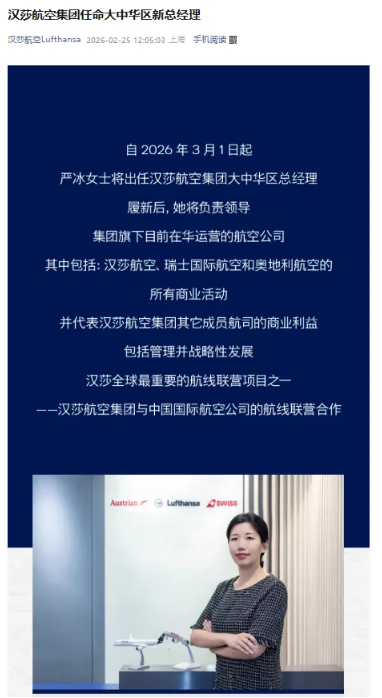 今日,汉莎航空集团官宣重磅人事任命: 自3月1日起,在集团任职超20年的严冰女士出任大中华区总经理,将坐镇上海统筹汉莎航空、瑞士国际航空、奥地利航空在华所有商业活动,并主导与国航的航线联营合作这一全球重要项目。