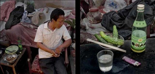 他卖儿童玩具,秋冬季烤地瓜、玉米等,住此7年多。他喜欢买膘肉烧菜,说是油多,有肥肉吃就很满足了;每天晚上喜欢喝点散装白酒,2斤装的一塑料桶7元钱,每3天喝一桶;抽的烟也是最便宜的黄果树,2元一包,但每天要抽3包。