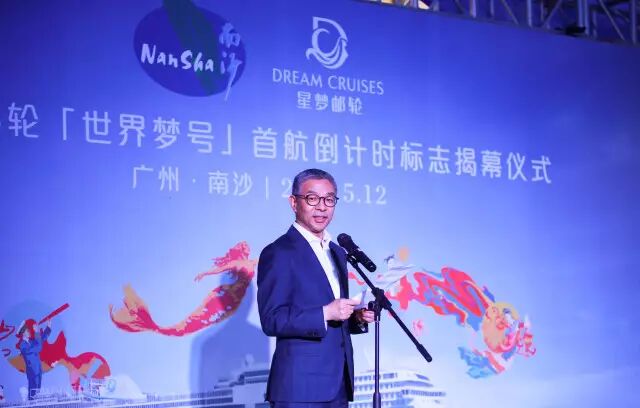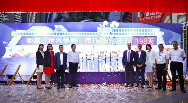 5月12日当天,星梦邮轮“世界梦号”在广州南沙举行了隆重的首航倒计时典礼,广州市南沙区人民政府副区长刘朝阳先生、南沙区旅游局局长洪旻琪先生、中交协邮轮游艇分会常务副会长兼秘书长郑炜航先生及云顶邮轮集团总裁朱福明先生,为“世界梦号”在全球的首次亮相揭幕。